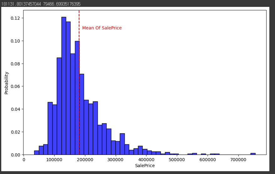 ax.text(mu - 0.85, 0.105, 'Mean Of SalePrice <-------', color = 'r')