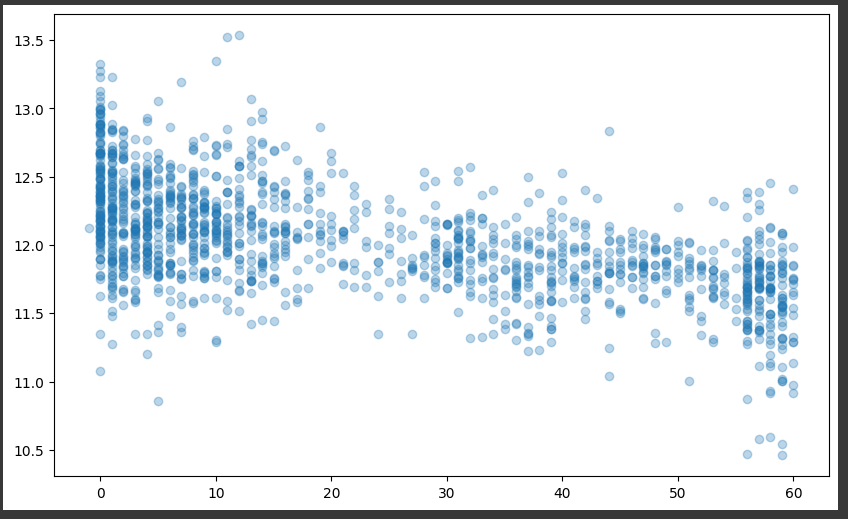 ax.scatter(YearSinceRemodel, y, alpha = 0.3)