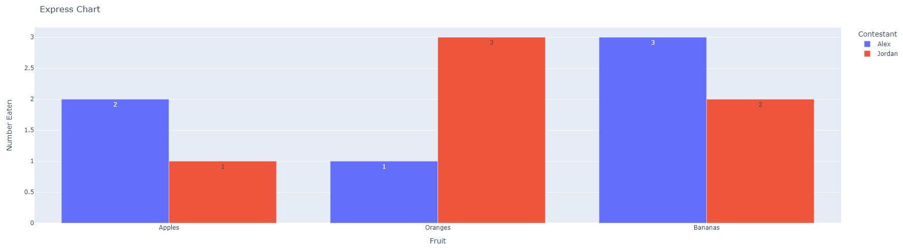 그리고 x축엔 'Fruit', y축엔 'Number Eaten'을 설정하고 color는 'contestant', barmode는 'group'으로 설정합니다.