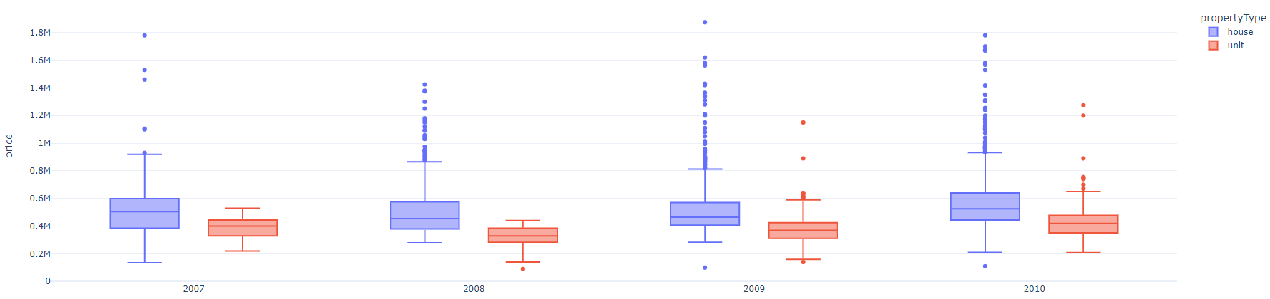 fig = px.box(result, x = 'year', y = 'price', color = 'propertyType')