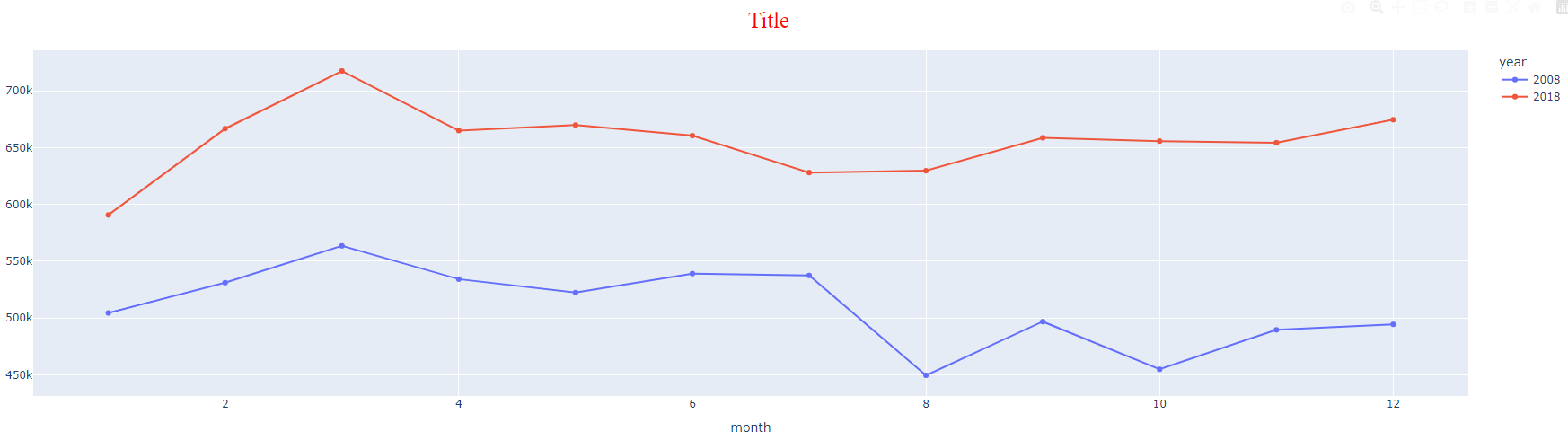 x 축은 month, y축은 price, color는 연도를 기준으로, markers 는 True로 해서 마커를 표시했습니다.